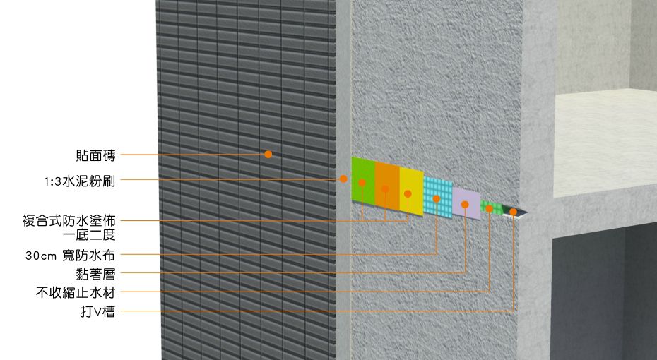 4、施作防水層:(1)黏著層 (2)防水布 (3)複合式防水材塗佈2道。